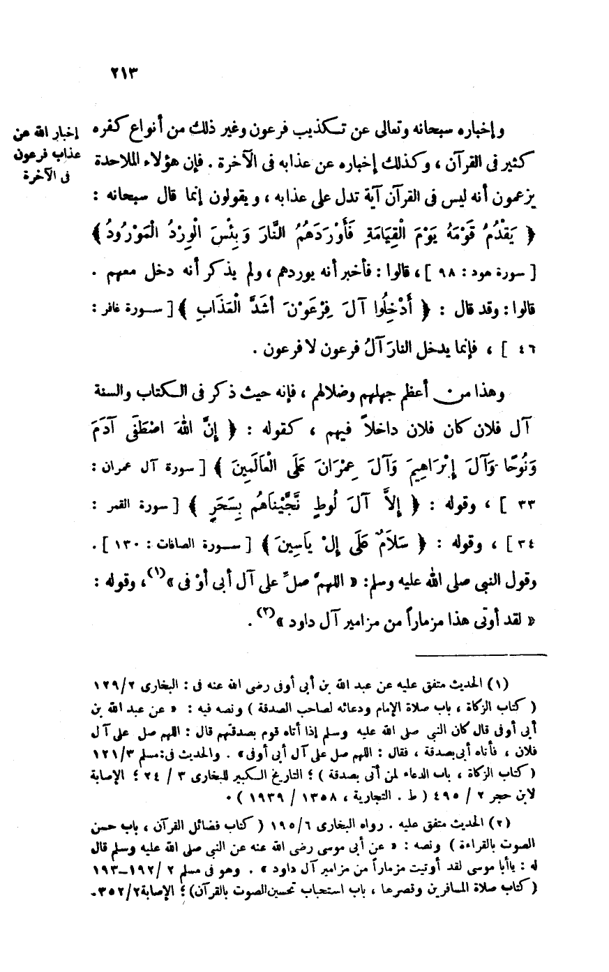 وَهَذَا من أعظم جهلهم وضلالهم، فَإِنَّهُ حَيْثُ ذكر فِي الْكتاب وَالسّنة آل فلَان كَانَ فلَان دَاخِلا فيهم، كَقَوْلِه: {إِن الله اصْطفى آدم ونوحا وَآل إِبْرَاهِيم وَآل عمرَان على الْعَالمين} [سُورَة آل عمرَان: 33] ، وَقَوله: {إِلَّا آل لوط نجيناهم بِسحر} [سُورَة الْقَمَر: 34] ، وَقَوله: {سَلام على إل ياسين} [سُورَة الصافات: 130] . وَقَول النَّبِي صلى الله عَلَيْهِ وَسلم: "اللَّهُمَّ صل على آل أبي أوفى"، وَقَوله: "لقد أُوتِيَ هَذَا مِزْمَارًا من مَزَامِير آل دَاوُد".