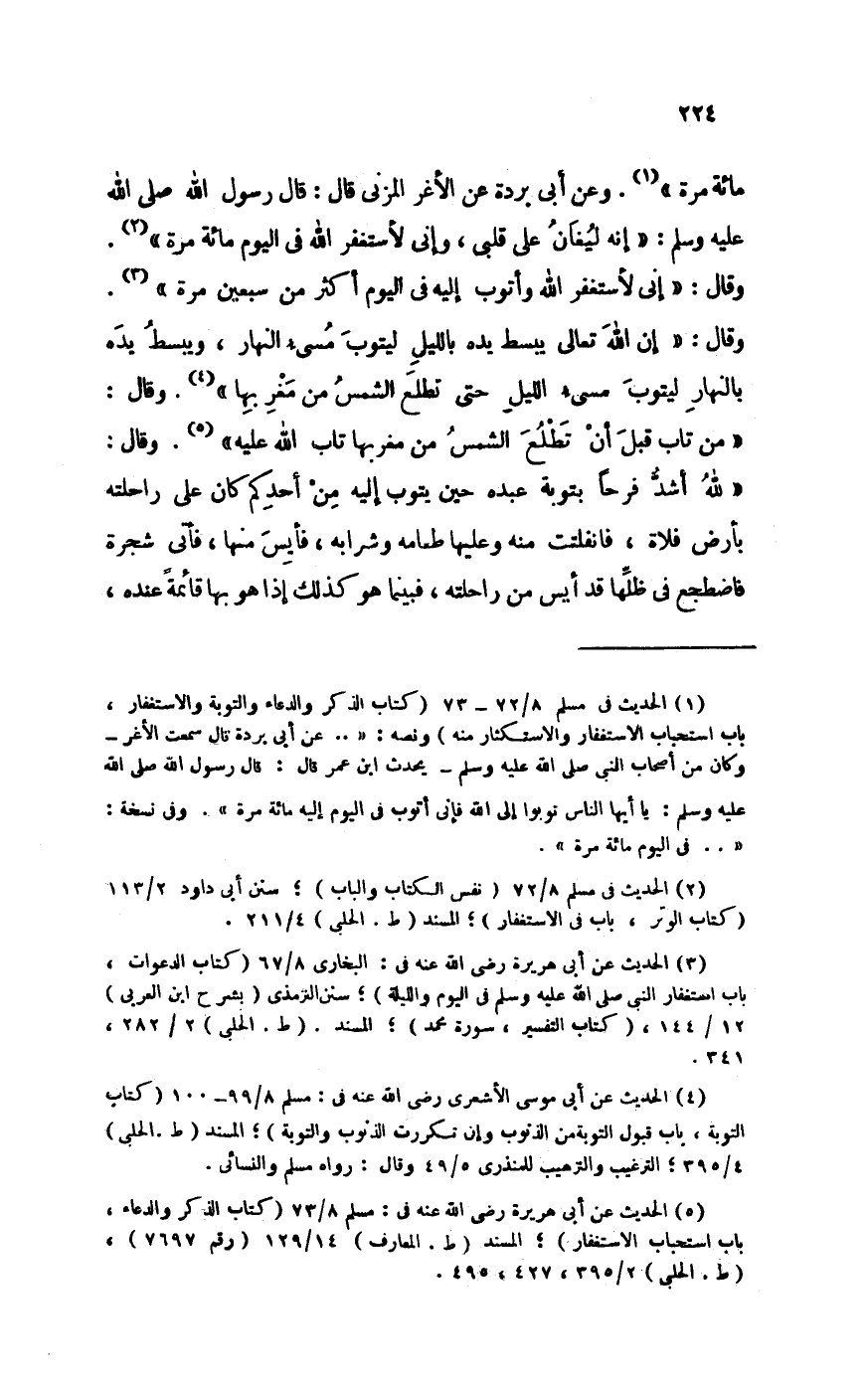 مائَة مرّة وَعَن أبي بردة عَن الْأَغَر الْمُزنِيّ قَالَ قَالَ رَسُول الله صلى الله عَلَيْهِ وَسلم إِنَّه ليغان على قلبِي وَإِنِّي لأستغفر الله فِي الْيَوْم مائَة مرّة وَقَالَ إِنِّي لأستغفر الله وَأَتُوب إِلَيْهِ فِي الْيَوْم أَكثر من سبعين مرّة وَقَالَ إِن الله تَعَالَى يبسط يَده بِاللَّيْلِ ليتوب مسيء النَّهَار ويبسط يَده بِالنَّهَارِ ليتوب مسيء اللَّيْل حَتَّى تطلع الشَّمْس من مغْرِبهَا وَقَالَ من تَابَ قبل أَن تطلع الشَّمْس من مغْرِبهَا تَابَ الله عَلَيْهِ وَقَالَ لله أَشد فَرحا بتوبة عَبده حِين يَتُوب إِلَيْهِ من أحدكُم كَانَ على رَاحِلَته بِأَرْض فلاة فانفلتت مِنْهُ وَعَلَيْهَا طَعَامه وَشَرَابه فأيس مِنْهَا فَأتى شَجَرَة فاضطجع فِي ظلها قد أيس من رَاحِلَته فَبَيْنَمَا هُوَ كَذَلِك إِذا هُوَ بهَا قَائِمَة عِنْده