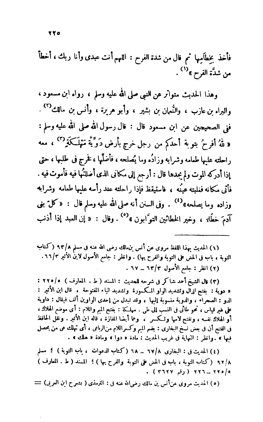 وَهَذَا الحَدِيث متواتر عَن النَّبِي صلى الله عَلَيْهِ وَسلم رَوَاهُ ابْن مَسْعُود والبراء بن عَازِب والنعمان بن بشير وَأَبُو هُرَيْرَة وَأنس بن مَالك فَفِي الصَّحِيحَيْنِ عَن ابْن معسود قَالَ قَالَ رَسُول الله صلى الله عَلَيْهِ وَسلم لله أفرح بتوبة أحدكُم من رجل خرج بِأَرْض دوية مهلكة مَعَه رَاحِلَته عَلَيْهَا طَعَامه وَشَرَابه وزاده وَمَا يصلحه فأضلها فَخرج فِي طلبَهَا حَتَّى إِذا أدْركهُ الْمَوْت وَلم يجدهَا قَالَ أرجع إِلَى مَكَاني الَّذِي أضللتها فِيهِ فأموت فِيهِ فَأتى مَكَانَهُ فغلبته عينه فَاسْتَيْقَظَ فَإِذا رَاحِلَته عِنْد رَأسه عَلَيْهَا طَعَامه وَشَرَابه وزاده وَمَا يصلحه وَفِي السّنَن أَنه صلى الله عَلَيْهِ وَسلم قَالَ كل بني آدم خطاء وَخير الْخَطَّائِينَ التوابون وَقَالَ إِن العَبْد إِذا أذْنب