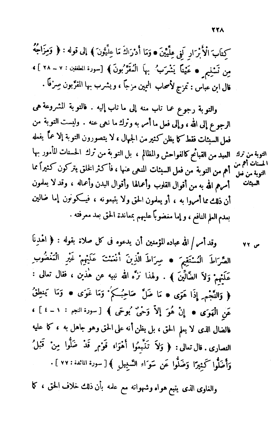 وَالتَّوْبَة رُجُوع عَمَّا تَابَ مِنْهُ إِلَى مَا تَابَ إِلَيْهِ فالتوبة الْمَشْرُوعَة هِيَ الرُّجُوع إِلَى الله وَإِلَى فعل مَا أَمر بِهِ وَترك مَا نهى عَنهُ وَلَيْسَت التَّوْبَة من فعل السَّيِّئَات فَقَط كَمَا يظنّ كثير من الْجُهَّال لَا يتصورون التَّوْبَة إِلَّا عَمَّا يَفْعَله العَبْد من القبائح كالفواحش والمظالم بل التَّوْبَة من ترك الْحَسَنَات الْمَأْمُور بهَا أهم من التَّوْبَة من فعل السَّيِّئَات الْمنْهِي عَنْهَا فَأكْثر الْخلق يتركون كثيرا مِمَّا أَمرهم الله بِهِ من أَقْوَال الْقُلُوب وأعمالها وأقوال الْبدن وأعماله وَقد لَا يعلمُونَ أَن ذَلِك مِمَّا أمروا بِهِ أَو يعلمُونَ الْحق وَلَا يتبعونه فيكونون إِمَّا ضَالِّينَ بِعَدَمِ الْعلم النافع وَإِمَّا مغضوبا عَلَيْهِم بمعاندة الْحق بعد مَعْرفَته