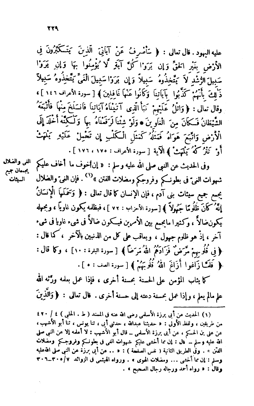 وَفِي الحَدِيث عَن النَّبِي صلى الله عَلَيْهِ وَسلم إِن أخوف مَا أَخَاف عَلَيْكُم شهوات الغي فِي بطونكم وفروجكم ومضلات الْفِتَن فَإِن الغي والضلال يجمع جَمِيع سيئات بني آدم فَإِن الْإِنْسَان كَمَا قَالَ تَعَالَى وَحملهَا الْإِنْسَان إِنَّه كَانَ ظلوما جهولا [سُورَة الْأَحْزَاب 72] فبظلمه يكون غاويا وبجهله يكون ضَالًّا وَكَثِيرًا مَا يجمع بَين الْأَمريْنِ فَيكون ضَالًّا فِي شَيْء غاويا فِي شَيْء آخر إِذْ هُوَ ظلوم جهول ويعاقب على كل من الذنبين بِالْآخرِ كَمَا قَالَ فِي قُلُوبهم مرض فَزَادَهُم الله مَرضا [سُورَة الْبَقَرَة 10] وكما قَالَ فَلَمَّا زاغوا أزاغ الله قُلُوبهم [سُورَة الصَّفّ 5]