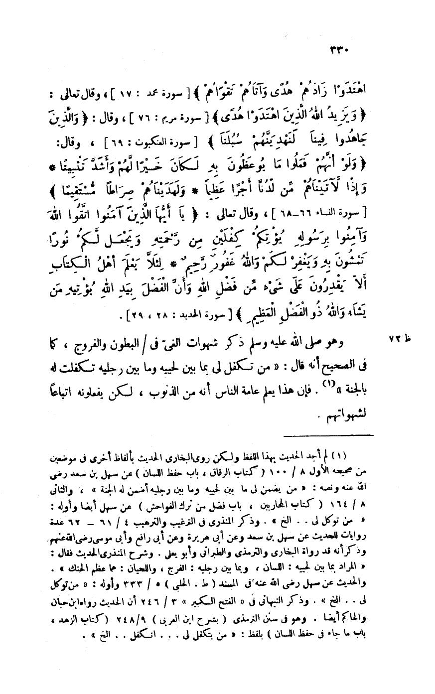 اهتدوا زادهم هدى وآتاهم تقواهم [سُورَة مُحَمَّد 17] وَقَالَ تَعَالَى وَيزِيد الله الَّذين اهتدوا هدى [سُورَة مَرْيَم 76] وَقَالَ وَالَّذين جاهدوا فِينَا لنهدينهم سبلنا [سُورَة العنكبوت 69] وَقَالَ وَلَو أَنهم فعلوا مَا يوعظون بِهِ لَكَانَ خيرا لَهُم وَأَشد تثبيتا وَإِذا لآتيناهم من لدنا أجرا عَظِيما ولهديناهم صراطا مُسْتَقِيمًا [سُورَة النِّسَاء 66 - 68] وَقَالَ تَعَالَى يَا أَيهَا الَّذين آمنُوا اتَّقوا الله وآمنوا بِرَسُولِهِ يُؤْتكُم كِفْلَيْنِ من رَحمته وَيجْعَل لكم نورا تمشون بِهِ وَيغْفر لكم وَالله غَفُور رَحِيم لِئَلَّا يعلم أهل الْكتاب أَلا يقدرُونَ على شَيْء من فضل الله وَأَن الْفضل بيد الله يؤتيه من يَشَاء وَالله ذُو الْفضل الْعَظِيم [سُورَة الْحَدِيد 28 - 29]