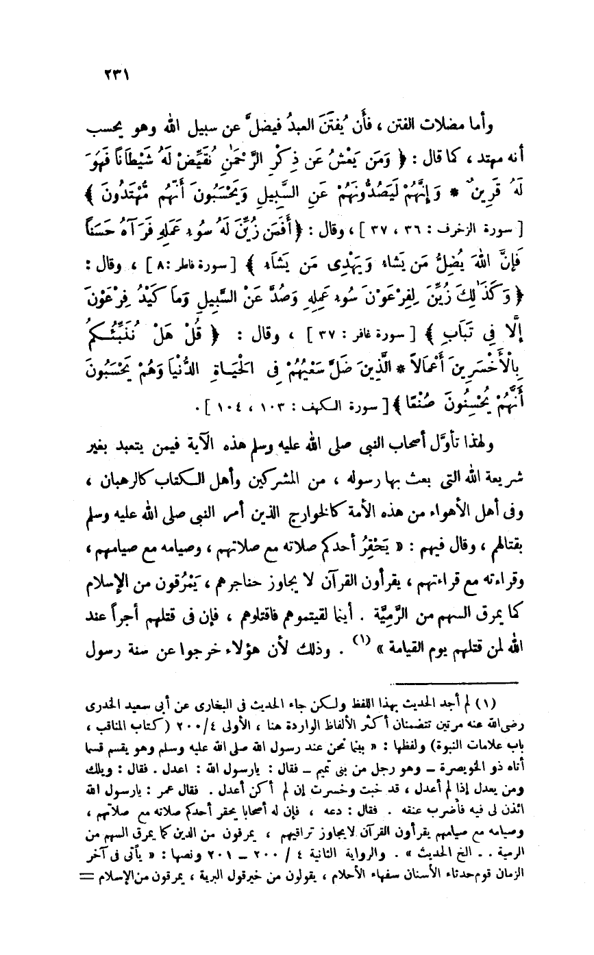 وَلِهَذَا تَأَول أَصْحَاب النَّبِي صلى الله عَلَيْهِ وَسلم هَذِه الْآيَة فِيمَن يتعبد بِغَيْر شَرِيعَة الله الَّتِي بعث بهَا رَسُوله من الْمُشْركين وَأهل الْكتاب كالرهبان وَفِي أهل الْأَهْوَاء من هَذِه الْأمة كالخوارج الَّذين أَمر النَّبِي صلى الله عَلَيْهِ وَسلم بقتالهم وَقَالَ فيهم يحقر أحدكُم صلَاته مَعَ صلَاتهم وصيامه مَعَ صِيَامهمْ وقراءته مَعَ قراءتهم يقرأون الْقُرْآن لَا يُجَاوز حَنَاجِرهمْ يَمْرُقُونَ من الْإِسْلَام كَمَا يَمْرُق السهْم من الرَّمية أَيْنَمَا لقيتموهم فاقتلوهم فَإِن فِي قَتلهمْ أجرا عِنْد الله لمن قَتلهمْ يَوْم الْقِيَامَة وَذَلِكَ لِأَن هَؤُلَاءِ خَرجُوا عَن سنة رَسُول