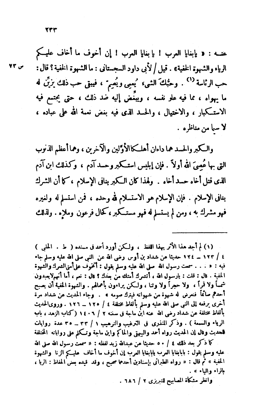 عَنهُ يَا بَغَايَا الْعَرَب يَا بَغَايَا الْعَرَب إِن أخوف مَا أَخَاف عَلَيْكُم الرِّيَاء والشهوة الْخفية قيل لأبي دَاوُد السجسْتانِي مَا الشَّهْوَة الْخفية قَالَ حب الرِّئَاسَة وحبك الشَّيْء يعمى ويصم فَيبقى حب ذَلِك يزين لَهُ مَا يهواه مِمَّا فِيهِ علو نَفسه وَيبغض إِلَيْهِ ضد ذَلِك حَتَّى يجْتَمع فِيهِ الإستكبار والإختيال والحسد الَّذِي فِيهِ بغض نعْمَة الله على عباده لَا سِيمَا من مناظره