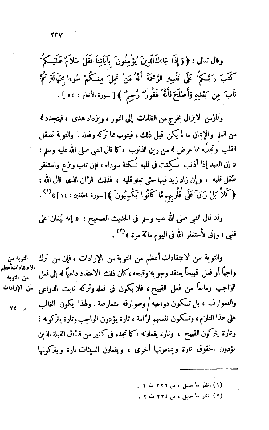 وَالتَّوْبَة من الاعتقادات أعظم من التَّوْبَة من الإرادات فَإِن من ترك وَاجِبا أَو فعل قبيحا يعْتَقد وُجُوبه وقبحه كَانَ ذَلِك الِاعْتِقَاد دَاعيا لَهُ إِلَى فعل الْوَاجِب ومانعا من فعل الْقَبِيح فَلَا يكون فِي فعله وَتَركه ثَابت الدَّوَاعِي والصوارف بل تكون دواعيه وصوارفه متعارضة وَلِهَذَا يكون الْغَالِب على هَذَا التَّلَوُّم وَتَكون نفسهم لوامة تَارَة يؤدون الْوَاجِب وَتارَة يتركونه وَتارَة يتركون الْقَبِيح وَتارَة يَفْعَلُونَهُ كَمَا تَجدهُ فِي كثير من فساق الْقبْلَة الَّذين يؤدون الْحُقُوق تَارَة ويمنعونها أُخْرَى ويفعلون السَّيِّئَات تَارَة ويتركونها