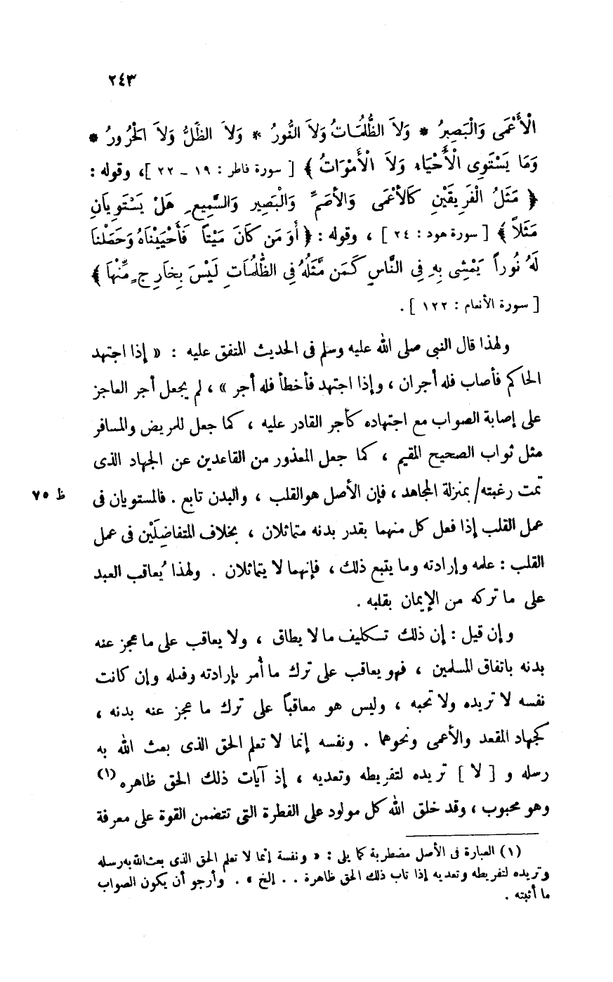 وَلِهَذَا قَالَ النَّبِي صلى الله عَلَيْهِ وَسلم فِي الحَدِيث الْمُتَّفق عَلَيْهِ إِذا اجْتهد الْحَاكِم فَأصَاب فَلهُ أَجْرَانِ وَإِذا اجْتهد فَأَخْطَأَ فَلهُ أجر لم يَجْعَل أجر الْعَاجِز على إِصَابَة الصَّوَاب مَعَ اجْتِهَاده كَأَجر الْقَادِر عَلَيْهِ كَمَا جعل للْمَرِيض وَالْمُسَافر مثل ثَوَاب الصَّحِيح الْمُقِيم كَمَا جعل الْمَعْذُور من القاعدين عَن الْجِهَاد الَّذِي تمت رغبته بِمَنْزِلَة الْمُجَاهِد فَإِن الأَصْل هُوَ الْقلب وَالْبدن تَابع فالمستويان فِي عمل الْقلب إِذا فعل كل مِنْهُمَا بِقدر بدنه متماثلان بِخِلَاف المتفاضلين فِي عمل الْقلب علمه وإرادته وَمَا يتبع ذَلِك فَإِنَّهُمَا لَا يتماثلان وَلِهَذَا يُعَاقب العَبْد على مَا تَركه من الْإِيمَان بِقَلْبِه