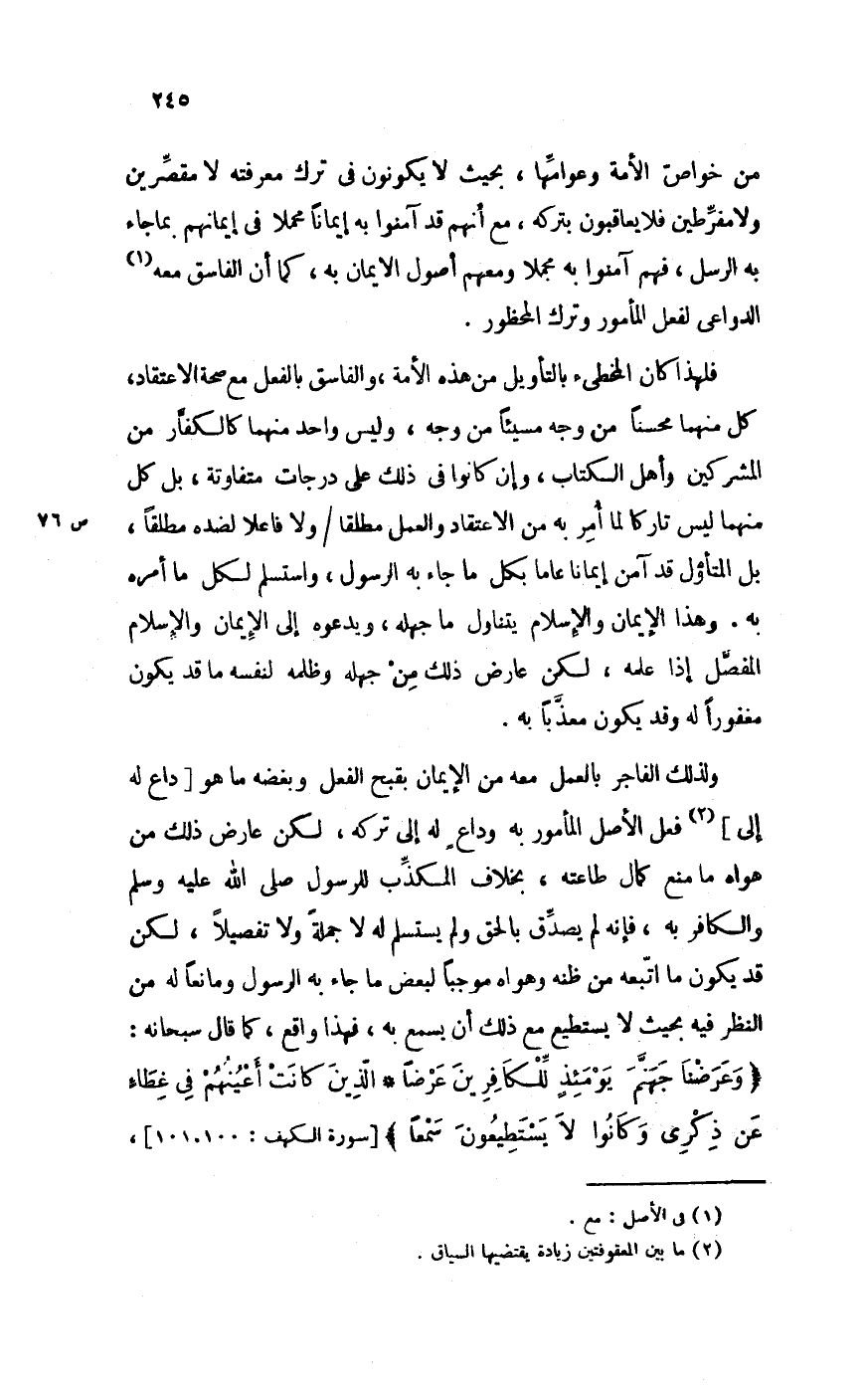 فَلهَذَا كَانَ المخطىء بالتأويل من هَذِه الْأمة وَالْفَاسِق بِالْفِعْلِ مَعَ صِحَة الِاعْتِقَاد كل مِنْهُمَا محسنا من وَجه مسيئا من وَجه وَلَيْسَ وَاحِد مِنْهُمَا كالكفار من الْمُشْركين وَأهل الْكتاب وَإِن كَانُوا فِي ذَلِك على دَرَجَات مُتَفَاوِتَة بل كل مِنْهُمَا لَيْسَ تَارِكًا لما أَمر بِهِ من الِاعْتِقَاد وَالْعَمَل مُطلقًا وَلَا فَاعِلا لضده مُطلقًا بل المتأول قد آمن إِيمَانًا عَاما بِكُل مَا جَاءَ بِهِ الرَّسُول واستسلم لكل مَا أمره بِهِ وَهَذَا الْإِيمَان وَالْإِسْلَام يتَنَاوَل مَا جَهله ويدعوه إِلَى الْإِيمَان وَالْإِسْلَام الْمفصل إِذا علمه لَكِن عَارض ذَلِك من جَهله وظلمه لنَفسِهِ مَا قد يكون مغفورا لَهُ وَقد يكون معذبا بِهِ