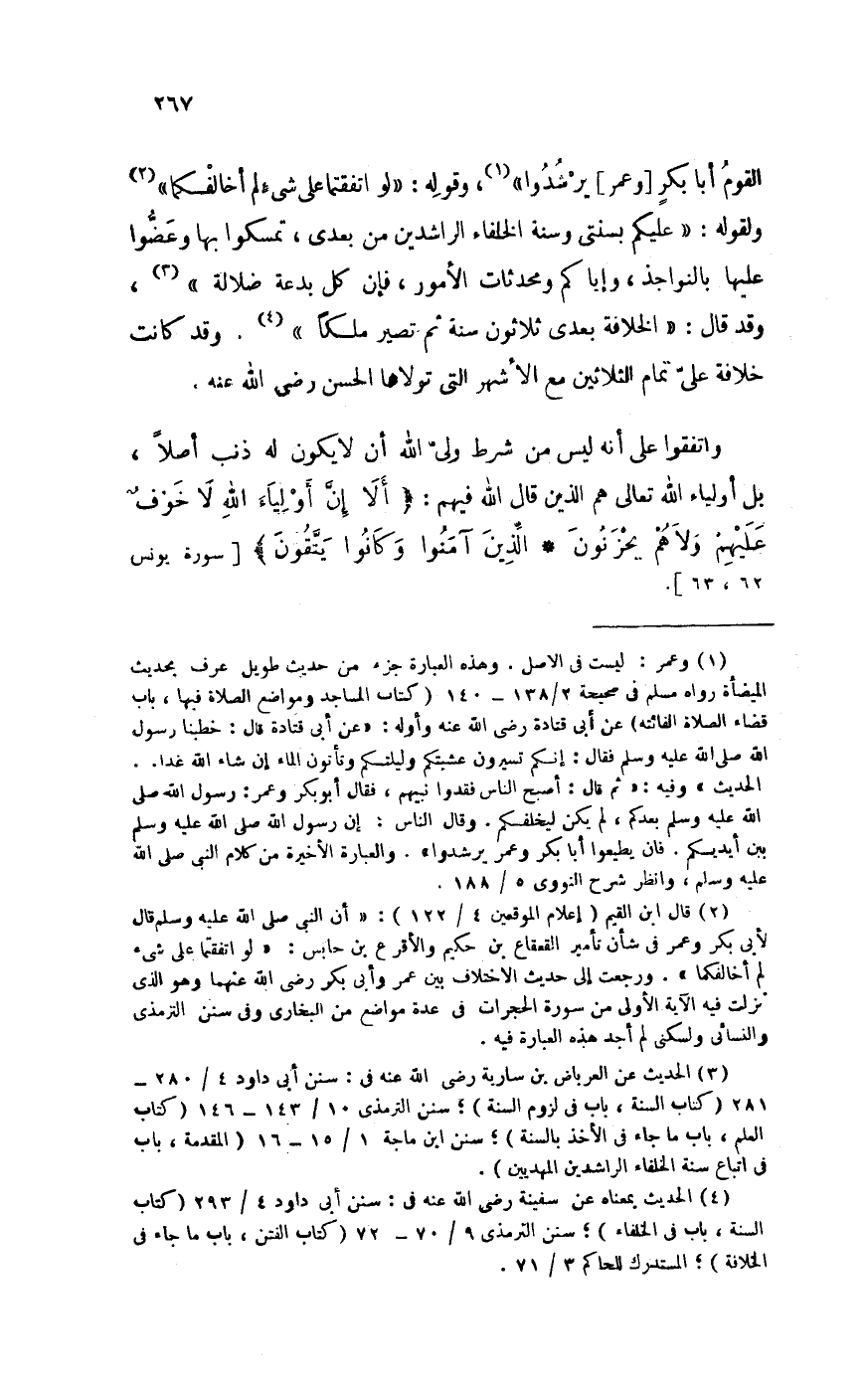 الْقَوْم أَبَا بكر وَعمر يرشدوا وَقَوله لَو اتفقتما على شَيْء لم أخالفكما وَلقَوْله عَلَيْكُم بِسنتي وَسنة الْخُلَفَاء الرَّاشِدين من بعدِي تمسكوا بهَا وعضوا عَلَيْهَا بالنواجذ وَإِيَّاكُم ومحدثات الْأُمُور فَإِن كل بِدعَة ضَلَالَة وَقد قَالَ الْخلَافَة بعدِي ثَلَاثُونَ سنة ثمَّ تصير ملكا وَقد كَانَت خلَافَة على تَمام الثَّلَاثِينَ مَعَ الْأَشْهر الَّتِي تولاها الْحسن رَضِي الله عَنهُ