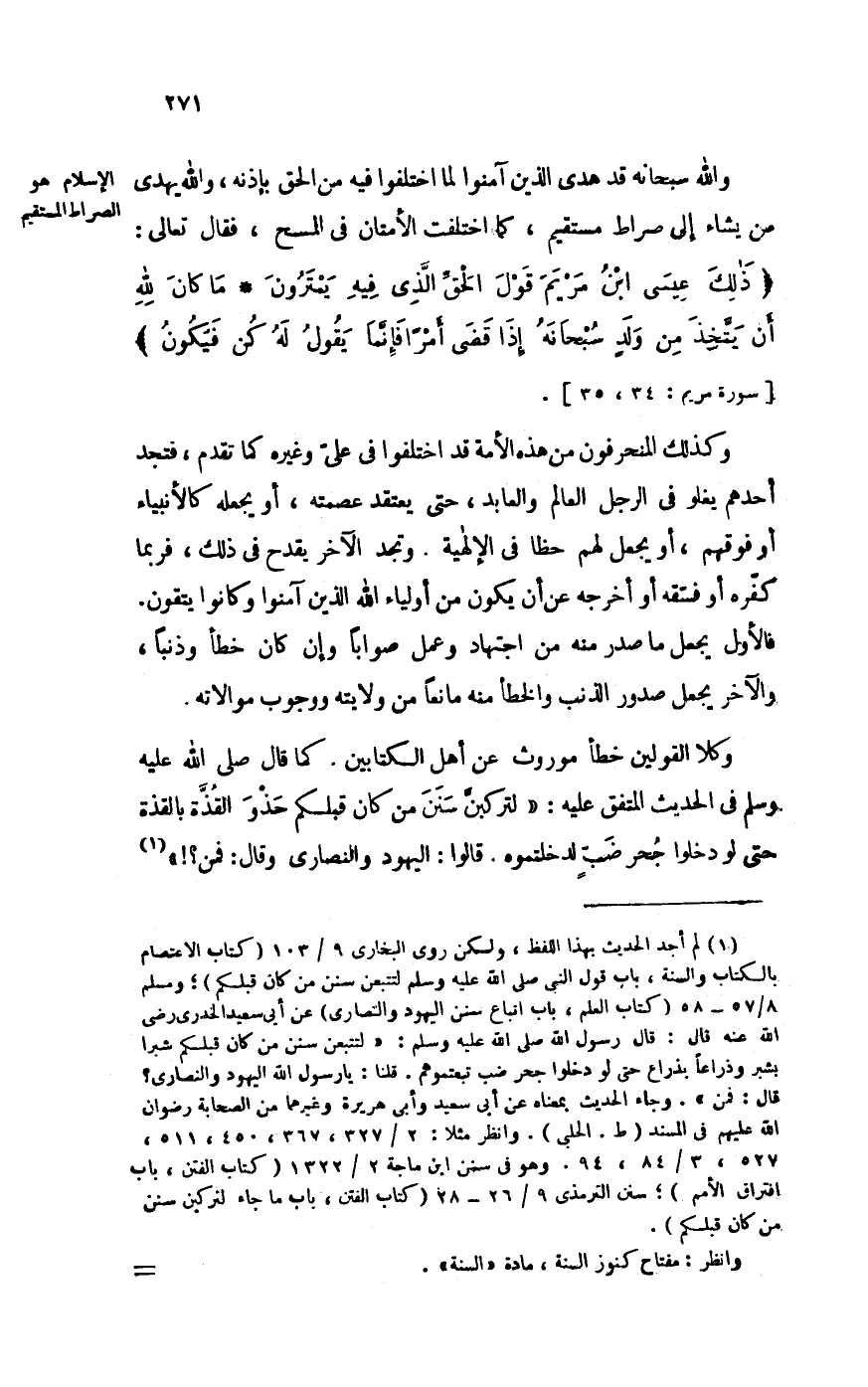 وَالله سُبْحَانَهُ قد هدى الَّذين آمنُوا لما اخْتلفُوا فِيهِ من الْحق بِإِذْنِهِ وَالله يهدي من يَشَاء إِلَى صِرَاط مُسْتَقِيم كَمَا اخْتلفت الأمتان فِي الْمسْح فَقَالَ تَعَالَى ذَلِك عِيسَى ابْن مَرْيَم قَول الْحق الَّذِي فِيهِ يمترون مَا كَانَ لله أَن يتَّخذ من ولد سُبْحَانَهُ إِذا قضى أمرا فَإِنَّمَا يَقُول لَهُ كن فَيكون [سُورَة مَرْيَم 34 - 35]