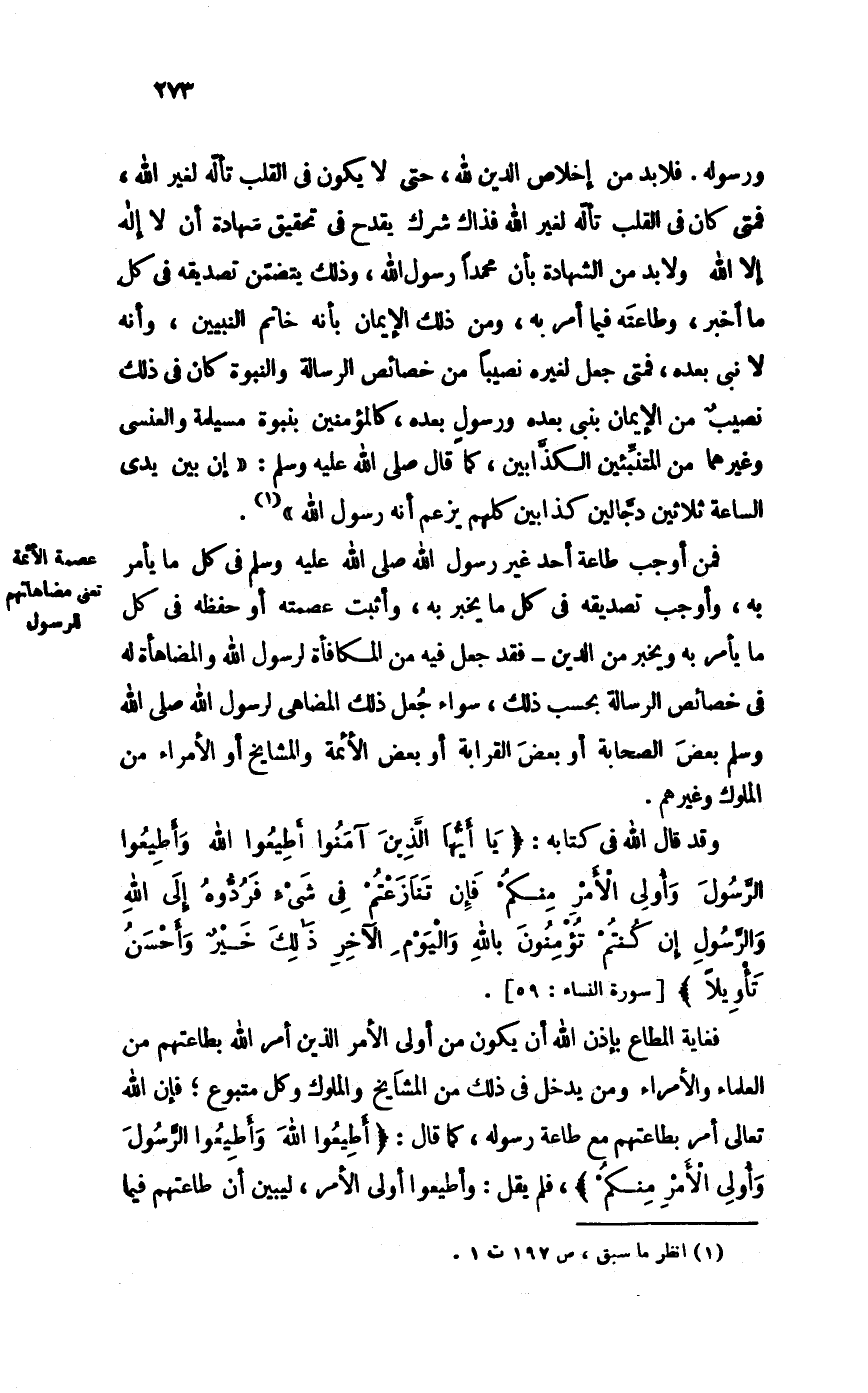 وَقد قَالَ الله فِي كِتَابه يَا أَيهَا الَّذين آمنُوا أطِيعُوا الله وَأَطيعُوا الرَّسُول وَالْأولَى الْأَمر مِنْكُم فَإِن تنازعتم فِي شَيْء فَردُّوهُ إِلَى الله وَالرَّسُول إِن كُنْتُم تؤمنون بِاللَّه وَالْيَوْم الآخر ذَلِك خير وَأحسن تَأْوِيلا [سُورَة النِّسَاء 59]