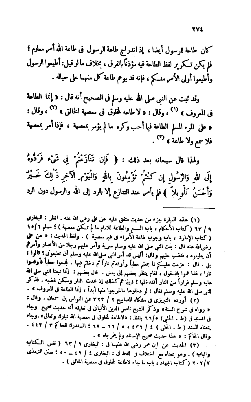 وَقد ثَبت عَن النَّبِي صلى الله عَلَيْهِ وَسلم فِي الصَّحِيح أَنه قَالَ إِنَّمَا الطَّاعَة فِي الْمَعْرُوف وَقَالَ لَا طَاعَة لمخلوق فِي مَعْصِيّة الْخَالِق وَقَالَ على الْمَرْء الْمُسلم الطَّاعَة فِيمَا أحب وَكره مَا لم يُؤمر بِمَعْصِيَة فَإِذا أَمر بِمَعْصِيَة فَلَا سمع وَلَا طَاعَة
