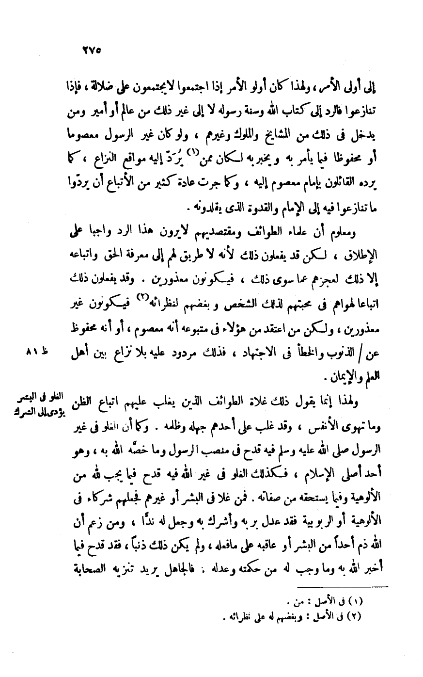 وَلِهَذَا إِنَّمَا يَقُول ذَلِك غلاة الطوائف الَّذين يغلب عَلَيْهِم اتِّبَاع الظَّن وَمَا تهوى الْأَنْفس وَقد غلب على أحدهم جَهله وظلمه وكما أَن الغلو فِي غير الرَّسُول صلى الله عَلَيْهِ وَسلم فِيهِ قدح فِي منصب الرَّسُول وَمَا خصّه الله بِهِ وَهُوَ أحد أُصَلِّي الْإِسْلَام فَكَذَلِك الغلو فِي غير الله فِيهِ قدح فِيمَا يجب لله من الألوهية وَفِيمَا يسْتَحقّهُ من صِفَاته فَمن غلا فِي الْبشر أَو غَيرهم فجعلهم شُرَكَاء فِي الألوهية أَو الربوبية فقد عدل بربه وأشرك بِهِ وَجعل لَهُ ندا وَمن زعم أَن الله ذمّ أحدا من الْبشر أَو عاقبه على مَا فعله وَلم يكن ذَلِك ذَنبا فقد قدح فِيمَا أخبر الله بِهِ وَمَا وَجب لَهُ من حكمته وعدله فالجاهل يُرِيد تَنْزِيه الصَّحَابَة