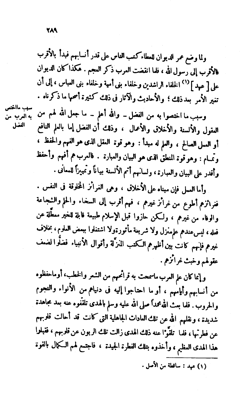وَسبب مَا اختصوا بِهِ من الْفضل وَالله أعلم مَا جعل الله لَهُم من الْعُقُول والألسنة والأخلاق والأعمال وَذَلِكَ أَن الْفضل إِمَّا بِالْعلمِ النافع أَو الْعَمَل الصَّالح وَالْعلم لَهُ مبدأ وَهُوَ قُوَّة الْعقل الَّذِي هُوَ الْفَهم وَالْحِفْظ وَتَمام وَهُوَ قُوَّة الْمنطق الَّذِي هُوَ الْبَيَان والعبارة فالعرب هم أفهم وأحفظ وأقدر على الْبَيَان والعبارة ولسانهم أتم الْأَلْسِنَة بَيَانا وتمييزا للمعاني