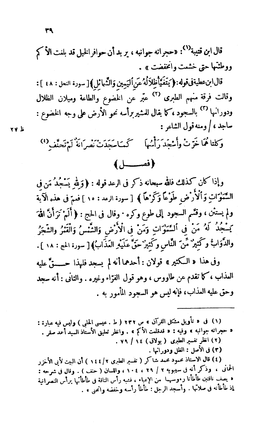 وَإِذا كَانَ كَذَلِك فَالله سُبْحَانَهُ ذكر فِي الرَّعْد قَوْله وَللَّه يسْجد من فِي السَّمَوَات وَالْأَرْض طَوْعًا وَكرها [سُورَة الرَّعْد 15] فَعم فِي هَذِه الْآيَة وَلم يسْتَثْن وَقسم السُّجُود إِلَى طوع وَكره وَقَالَ فِي الْحَج ألم تَرَ أَن الله يسْجد لَهُ من فِي السَّمَوَات وَمن فِي الأَرْض وَالشَّمْس وَالْقَمَر وَالشَّجر وَالدَّوَاب وَكثير من النَّاس وَكثير حق عَلَيْهِ الْعَذَاب [سُورَة الْحَج 18]
