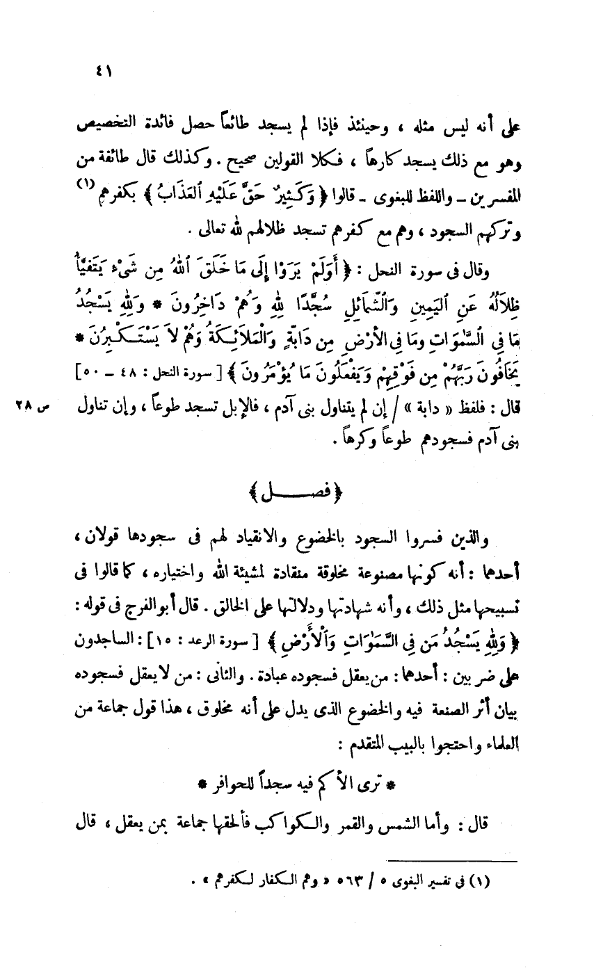 وَقَالَ فِي [سُورَة النَّحْل أولم يرَوا إِلَى مَا خلق الله من شَيْء يتفيأ ظلاله عَن الْيَمين وَالشَّمَائِل سجدا لله وهم داخرون وَللَّه يسْجد مَا فِي السَّمَوَات وَمَا فِي الأَرْض من دَابَّة وَالْمَلَائِكَة وهم لَا يستكبرن يخَافُونَ رَبهم من فَوْقهم ويفعلون مَا يؤمرون سُورَة النَّحْل 48 - 50] قَالَ فَلفظ دَابَّة إِن لم يتَنَاوَل بني آدم فالإبل تسْجد طَوْعًا وَإِن تنَاول بني آدم فسجودهم طَوْعًا وَكرها