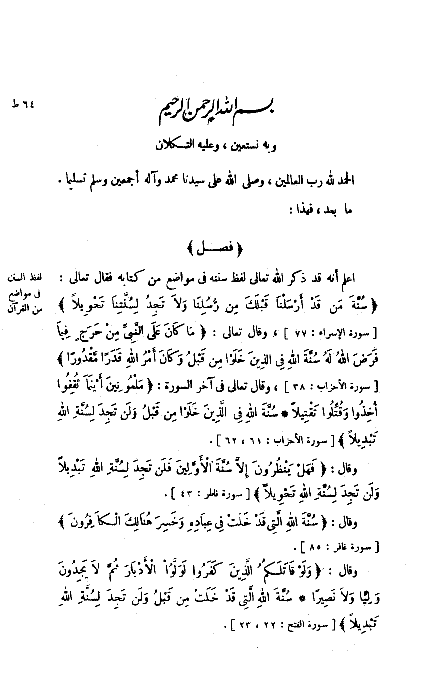 اعْلَم أَنه قد ذكر الله تَعَالَى لفظ سنَنه فِي مَوَاضِع من كِتَابه فَقَالَ تَعَالَى سنة من قد أرسلنَا قبلك من رسلنَا وَلَا تَجِد لسنتنا تحويلا [سُورَة الْإِسْرَاء 77] وَقَالَ تَعَالَى مَا كَانَ على النَّبِي من حرج فِيمَا فرض الله لَهُ سنة الله فِي الَّذين خلوا من قبل وَكَانَ أَمر الله قدرا مَقْدُورًا [سُورَة الْأَحْزَاب 38] وَقَالَ تَعَالَى فِي آخر السُّورَة ملعونين أَيْنَمَا ثقفوا أخذُوا وَقتلُوا تقتيلا سنة الله فِي الَّذين خلوا من قبل وَلنْ تَجِد لسنة الله تبديلا [سُورَة الْأَحْزَاب 61 - 62]