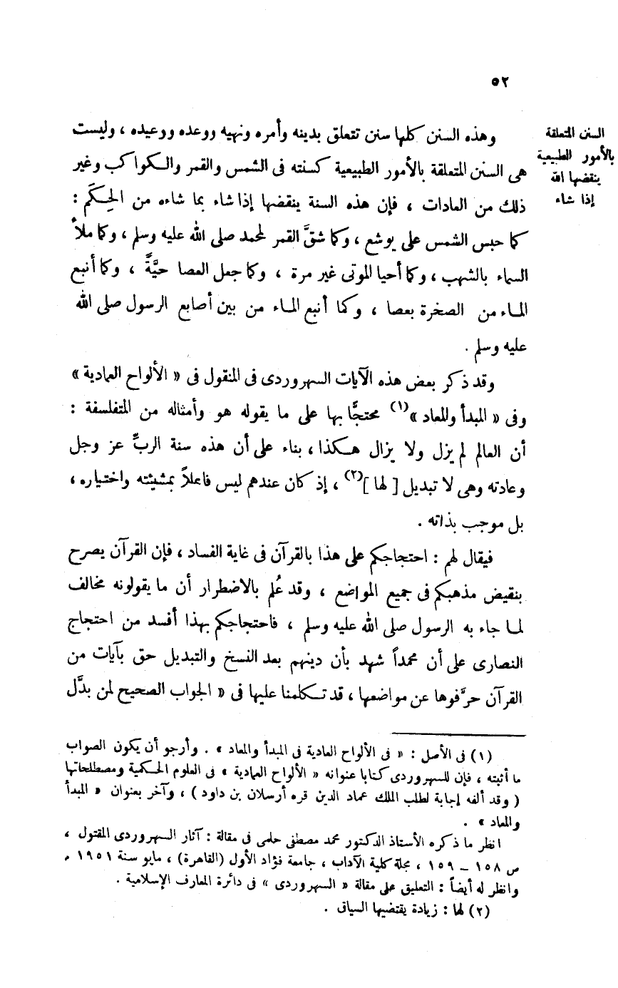 وَقد ذكر بعض هَذِه الْآيَات السهروردي فِي الْمَنْقُول فِي الألواح الْعمادِيَّة وَفِي المبدأ والمعاد محتجا بهَا على مَا يَقُوله هُوَ أَمْثَاله من المتفلسفة أَن الْعَالم لم يزل وَلَا يزَال هَكَذَا بِنَاء على أَن هَذِه سنة الرب عز وجلّ وعادته وَهِي لَا تَبْدِيل لَهَا إِذْ كَانَ عِنْدهم لَيْسَ فَاعِلا بمشيئته واختياره بل مُوجب بِذَاتِهِ