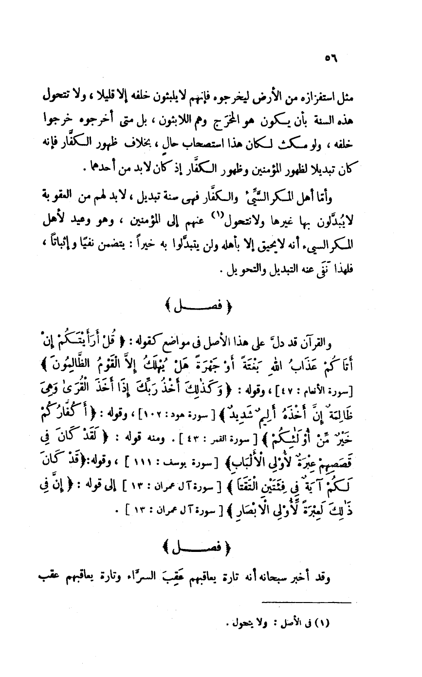 مثل استفزازه من الأَرْض ليخرجوه فَإِنَّهُم لَا يلبثُونَ خَلفه إِلَّا قَلِيلا وَلَا تتحول هَذِه السّنة بِأَن يكون هُوَ الْمخْرج وهم اللابثون بل مَتى أَخْرجُوهُ خَرجُوا خَلفه وَلَو مكث لَكَانَ هَذَا اسْتِصْحَاب حَال بِخِلَاف ظُهُور الْكفَّار فَإِنَّهُ كَانَ تبديلا لظُهُور الْمُؤمنِينَ وَظُهُور الْكفَّار إِذْ كَانَ لَا بُد من أَحدهمَا
