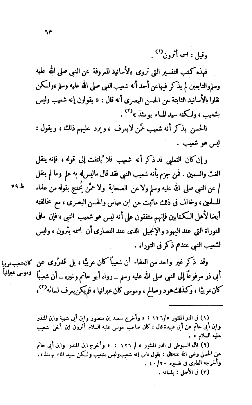 وَقد ذكر غير وَاحِد من الْعلمَاء أَن شعيبا كَانَ عَرَبيا بل قد رُوِيَ عَن أبي ذَر مَرْفُوعا إِلَى النَّبِي صلى الله عَلَيْهِ وَسلم رَوَاهُ أَبُو حَاتِم وَغَيره أَن شعيبا كَانَ عَرَبيا وَكَذَلِكَ هود وَصَالح ومُوسَى كَانَ عبرانيا فَلم يكن يعرف لِسَانه