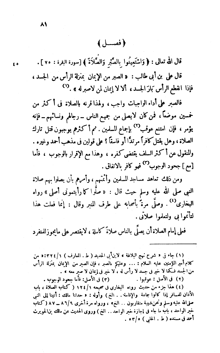 قَالَ عَليّ بن أبي طَالب الصَّبْر من الْإِيمَان بِمَنْزِلَة الرَّأْس من الْجَسَد فَإِذا انْقَطع الرَّأْس بار الْجَسَد أَلا لَا إِيمَان لمن لَا صَبر لَهُ