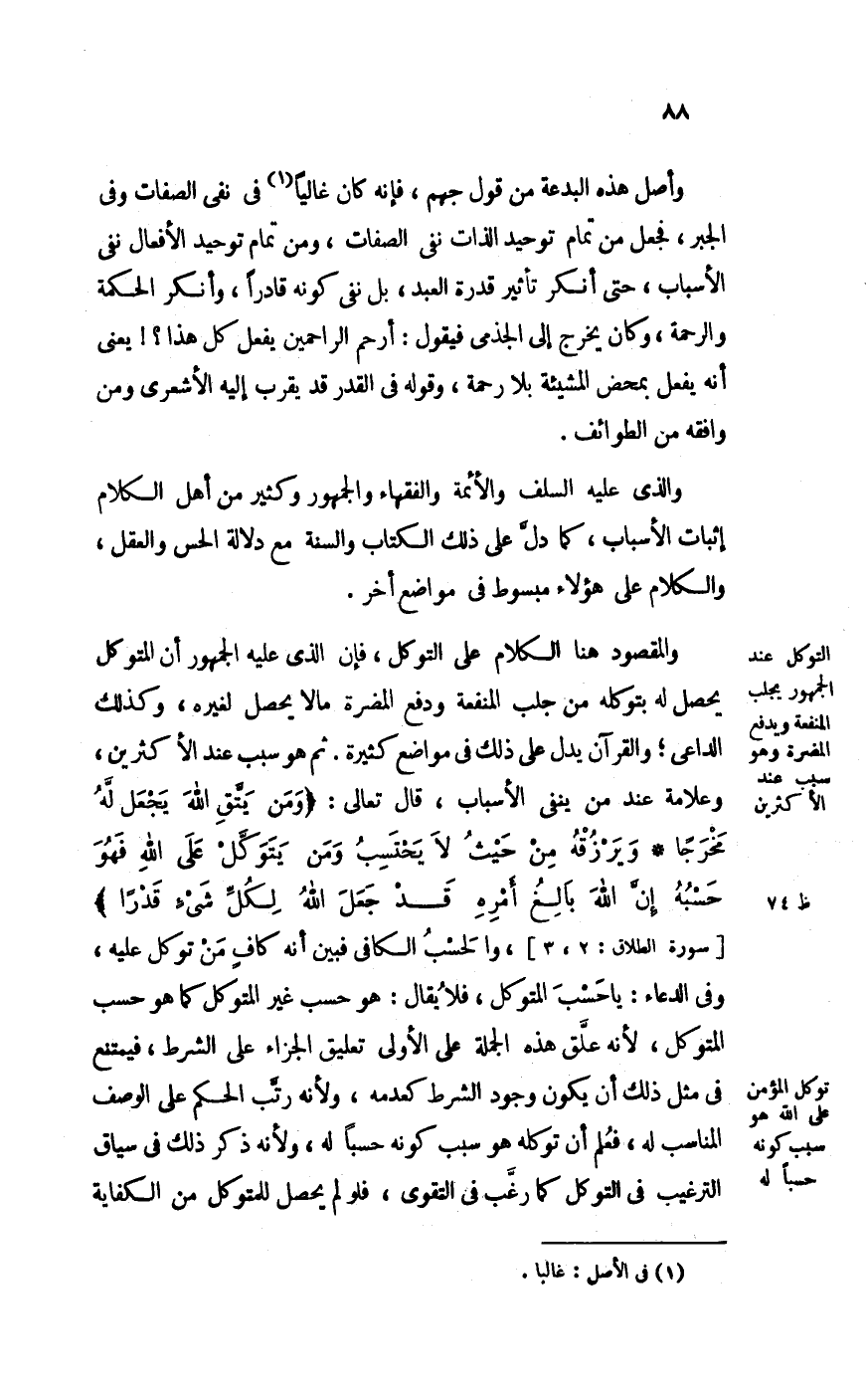 وَالَّذِي عَلَيْهِ السّلف وَالْأَئِمَّة وَالْفُقَهَاء وَالْجُمْهُور وَكثير من أهل الْكَلَام إِثْبَات الْأَسْبَاب كَمَا دلّ على ذَلِك الْكتاب وَالسّنة مَعَ دلَالَة الْحس وَالْعقل وَالْكَلَام على هَؤُلَاءِ مَبْسُوط فِي مَوَاضِع أخر
