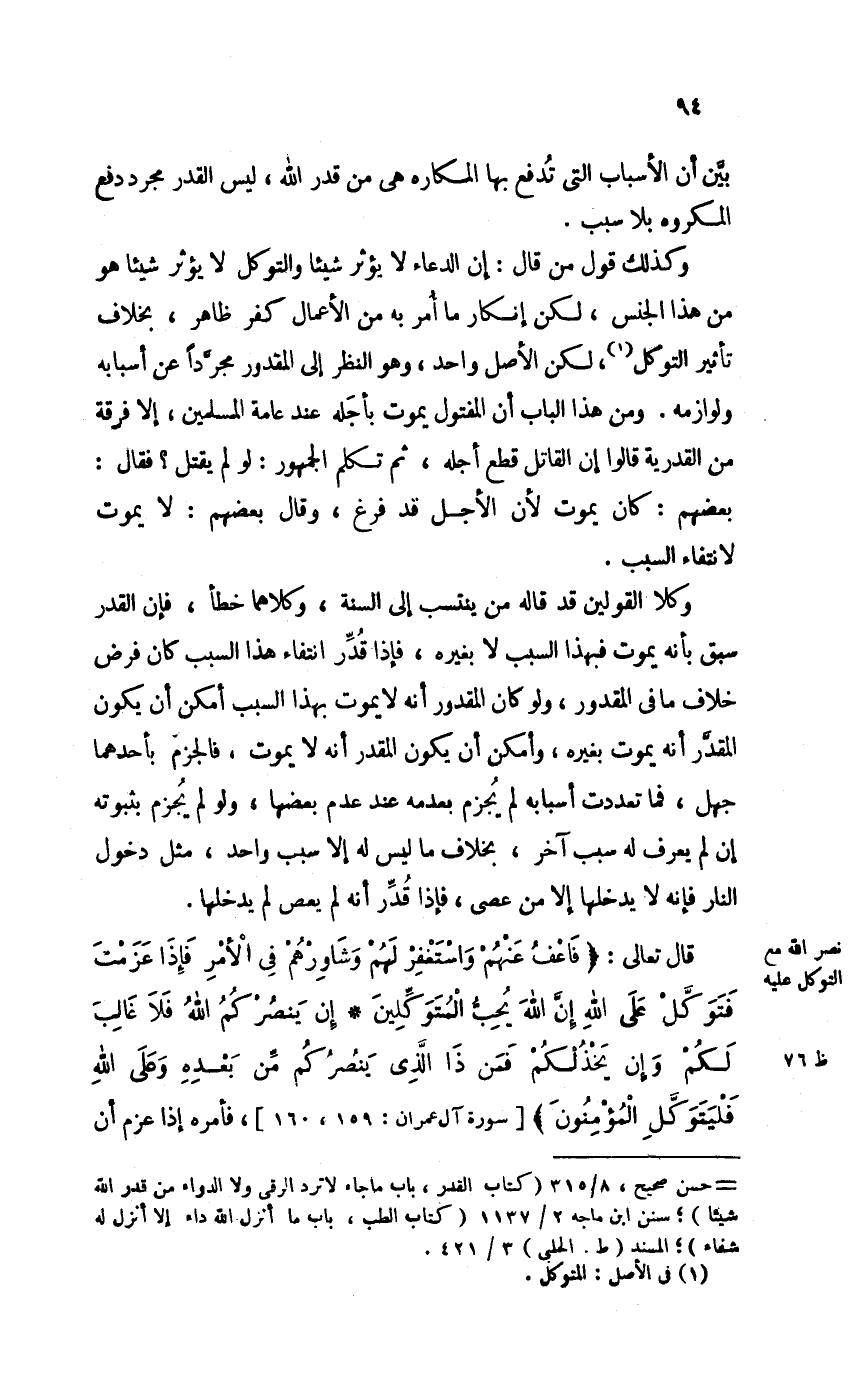 وَكَذَلِكَ قَول من قَالَ إِن الدُّعَاء لَا يُؤثر شَيْئا والتوكل لَا يُؤثر شَيْئا هُوَ من هَذَا الْجِنْس لَكِن إِنْكَار مَا أَمر بِهِ من الْأَعْمَال كفر ظَاهر بِخِلَاف تَأْثِير التَّوَكُّل وَلَكِن الأَصْل وَاحِد وَهُوَ النّظر إِلَى المقدرو مُجَردا عَن أَسبَابه ولوازمه وَمن هَذَا الْبَاب أَن الْمَقْتُول يَمُوت بأجله عِنْد عَامَّة الْمُسلمين إِلَّا فرقة من الْقَدَرِيَّة قَالُوا إِن الْقَاتِل قطع أَجله ثمَّ تكلم الْجُمْهُور لَو لم يقتل فَقَالَ بَعضهم كَانَ يَمُوت لِأَن الْأَجَل قد فرغ وَقَالَ بَعضهم لَا يَمُوت لانْتِفَاء السَّبَب