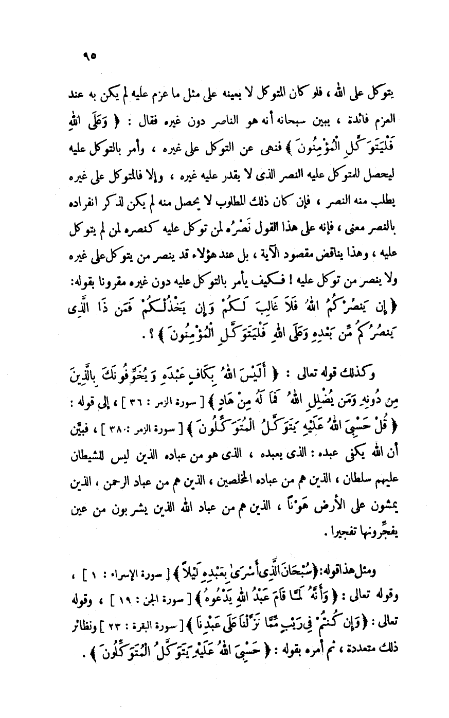 وَكَذَلِكَ قَوْله تَعَالَى أَلَيْسَ الله بكاف عَبده ويخوفونك بالذين من دونه وَمن يضلل الله فَمَا لَهُ من هاد [سُورَة الزمر 36] إِلَى قَوْله قل حسبي الله عَلَيْهِ يتوكل المتوكلون [سُورَة الزمر 38] فَبين أَن الله يَكْفِي عَبده الَّذِي يعبده الَّذِي هُوَ من عباده الَّذين لَيْسَ للشَّيْطَان عَلَيْهِم سُلْطَان الَّذين هم من عباده المخلصين الَّذين هم من عباد الرَّحْمَن الَّذين يَمْشُونَ على الأَرْض هونا الَّذين هم من عباد الله الَّذين يشربون من عين يفجرونها تفجيرا