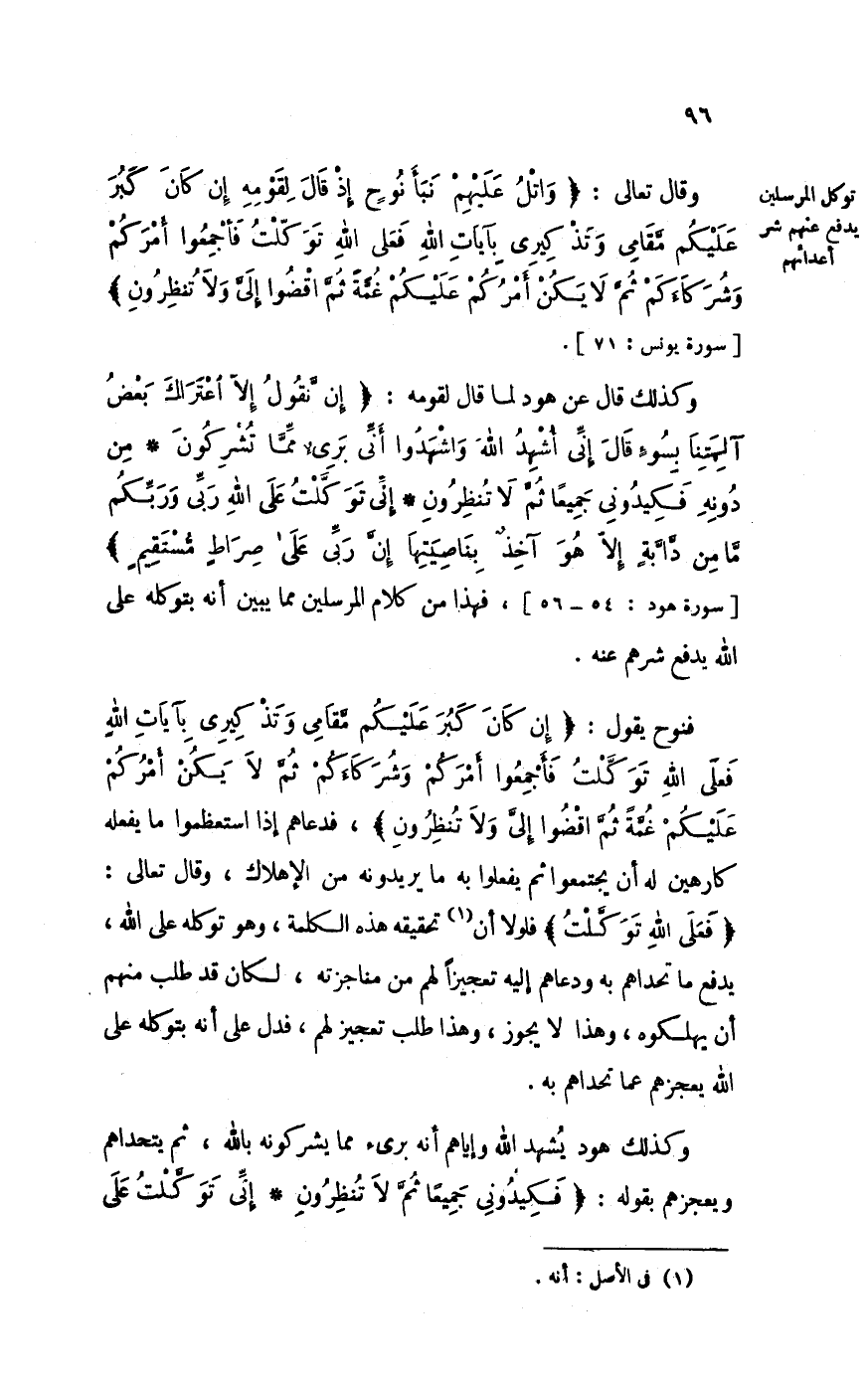 فنوح يَقُول إِن كَانَ كبر عَلَيْكُم مقَامي وتذكيري بآيَات الله فعلى الله توكلت فَأَجْمعُوا أَمركُم وشركاءكم ثمَّ لَا يكن أَمركُم عَلَيْكُم غمَّة ثمَّ اقضوا إِلَيّ وَلَا تنْظرُون فَدَعَاهُمْ إِذا استعظموا مَا يَفْعَله كارهين لَهُ أَن يجتمعوا ثمَّ يَفْعَلُوا بِهِ مَا يريدونه من الإهلاك وَقَالَ تَعَالَى فعلى الله توكلت فلولا أَن تَحْقِيقه هَذِه الْكَلِمَة وَهُوَ توكله على الله يدْفع مَا تحداهم بِهِ ودعاهم إِلَيْهِ تعجيزا لَهُم من مناجزته لَكَانَ قد طلب مِنْهُم أَن يهلكوه وَهَذَا لَا يجوز وَهَذَا طلب تعجيز لَهُم فَدلَّ على أَنه بتوكله على الله يعجزهم عَمَّا تحداهم بِهِ