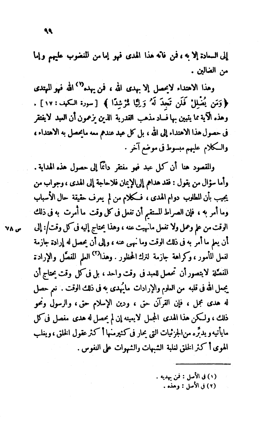وَهَذَا الإهتداء لَا يحصل إِلَّا بهدى الله فَمن يهده الله فَهُوَ الْمُهْتَدي وَمن يضلل فَلَنْ تَجِد لَهُ وليا مرشدا [سُورَة الْكَهْف 17] وَهَذِه الْآيَة مِمَّا يتَبَيَّن بهَا فَسَاد مَذْهَب الْقَدَرِيَّة الَّذين يَزْعمُونَ أَن العَبْد لَا يفْتَقر فِي حُصُول هَذَا الإهتداء إِلَى الله بل كل عبد عِنْدهم مَعَه مَا يحصل بِهِ الإهتداء وَالْكَلَام عَلَيْهِم مَبْسُوط فِي مَوضِع آخر