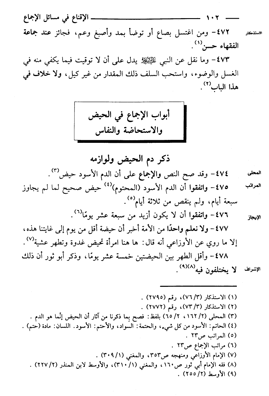 ٤٧٧ - ولا نعلم واحدًا من الأمة أخبر أن حيضة أقل من يوم إلى غايتنا هذه، إلا ما روى عن الأوزاعي أنه قال: هاهنا امرأة تحيض غدوة وتطهر عشية.