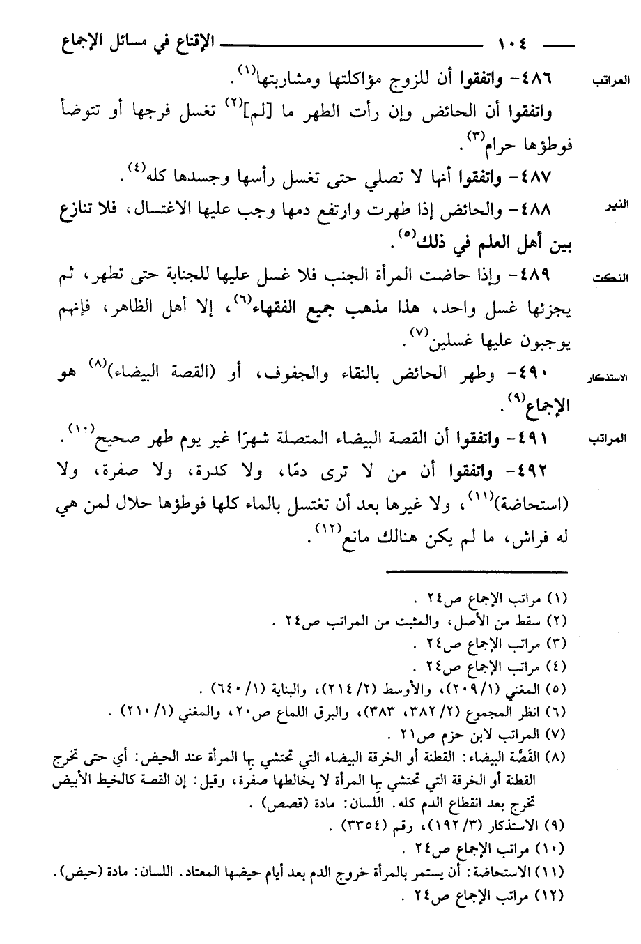 ٤٩٠ - وطهر الحائض بالنقاء والجفوف، أو (القصة البيضاء) هو الإجماع.