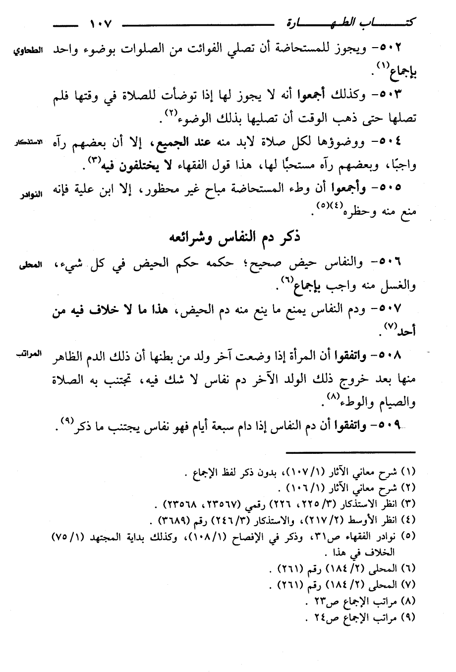 ٥٠٧ - ودم النفاس يمنع ما ينع منه دم الحيض، هذا ما لا خلاف فيه من أحد.