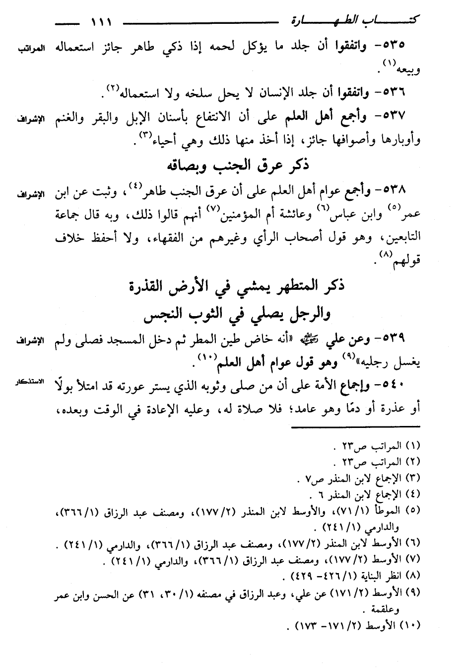 ٥٣٨ - وأجمع عوام أهل العلم على أن عرق الجنب طاهر، وثبت عن ابن عمر وابن عباس وعائشة أم المؤمنين أنهم قالوا ذلك، وبه قال جماعة التابعين، وهو قول أصحاب الرأي وغيرهم من الفقهاء، ولا أحفظ خلاف قولهم.