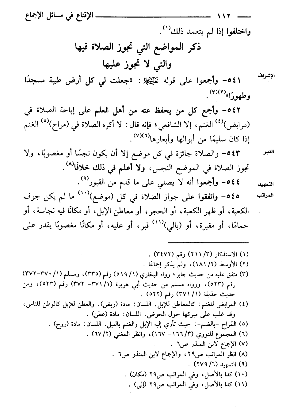 ٥٤١ - وأجمعوا على قوله عليه السلام: «جعلت لي كل أرض طيبة مسجدًا وطهورًا».