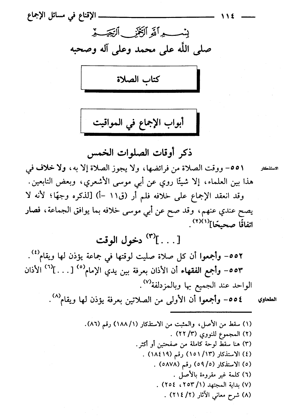 ٥٥٣ - وأجمع الفقهاء أن الأذان بعرفة بين يدي الإمام [...] الأذان الواحد عند الجميع بها وبالمزدلفة.