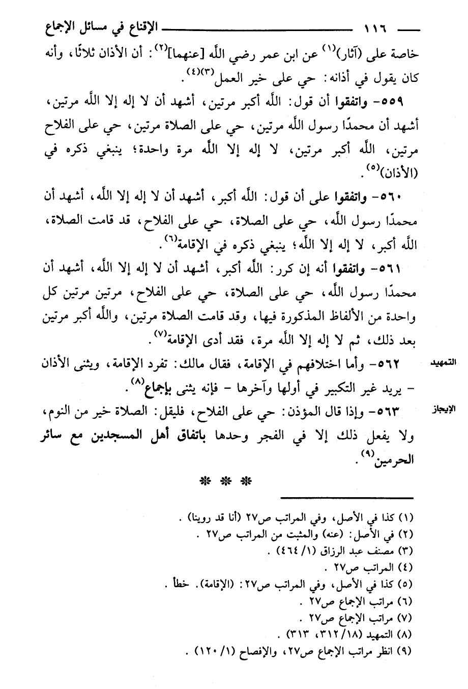 ٥٦٠ - واتفقوا على أن قول: الله أكبر، أشهد أن لا إله إلا الله، أشهد أن محمدًا رسول الله، حي على الصلاة، حي على الفلاح، قد قامت الصلاة، الله أكبر، لا إله إلا الله؛ ينبغي ذكره في الإقامة.