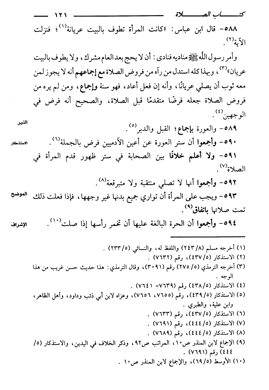 ٥٩١ - ولا أعلم خلافا بين الصحابة في ستر ظهور قدم المرأة في الصلاة.