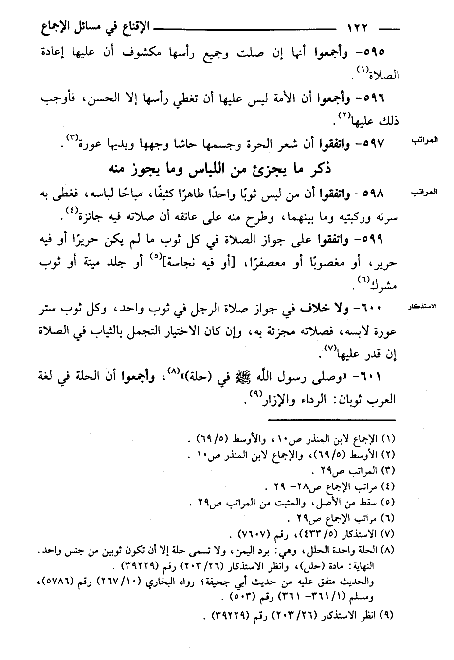 ٥٩٩ - واتفقوا على جواز الصلاة في كل ثوب ما لم يكن حريرًا أو فيه حرير، أو مغصوبًا أو معصفرًا، [أو فيه نجاسة] أو جلد ميتة أو ثوب مشرك.