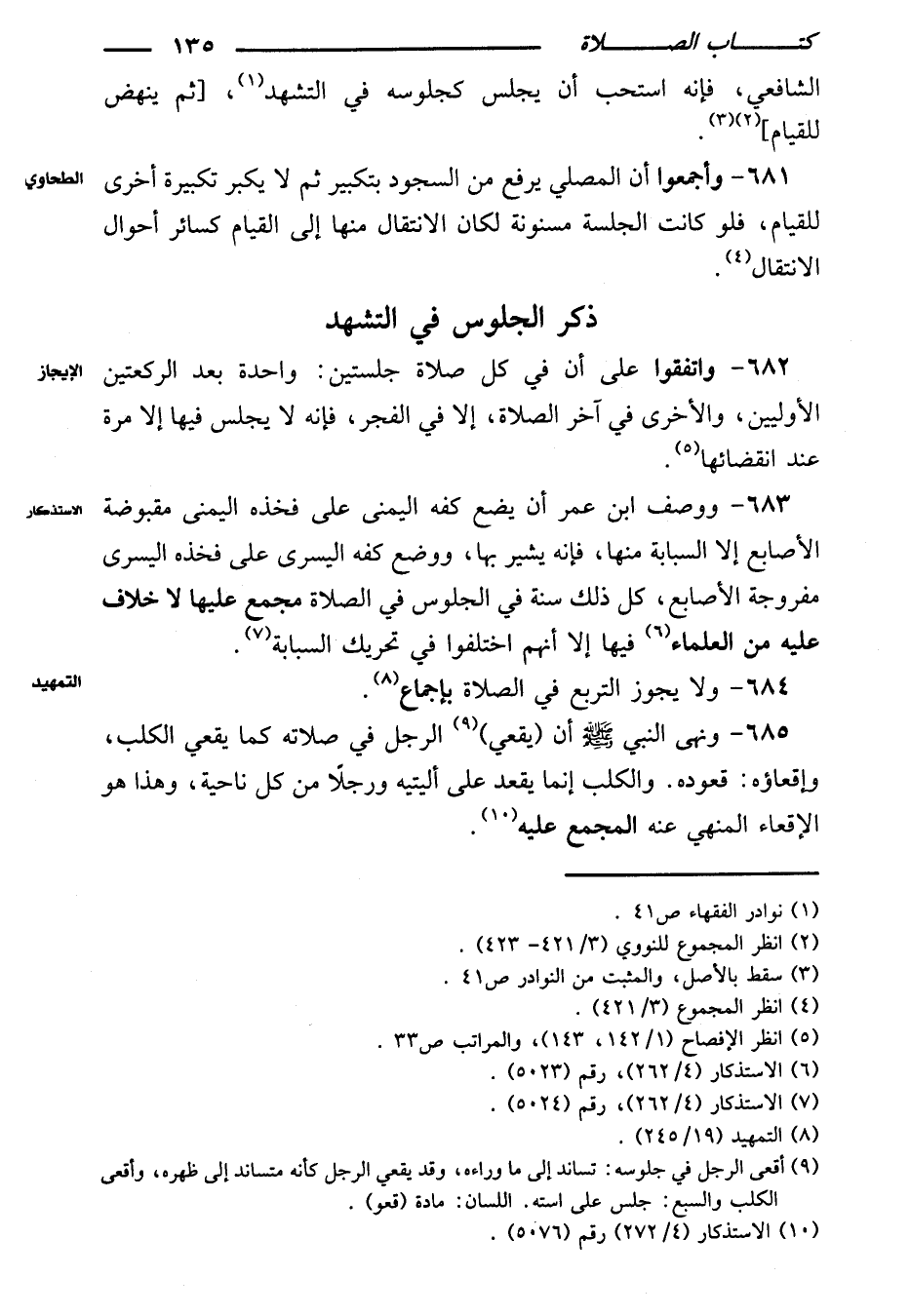 ٦٨١ - وأجمعوا أن المصلي يرفع من السجود بتكبير ثم لا يكبر تكبيرة أخرى للقيام، فلو كانت الجلسة مسنونة لكان الانتقال منها إلى القيام كسائر أحوال الانتقال.