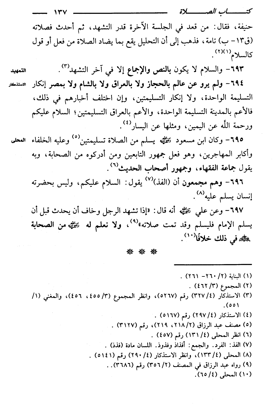 ٦٩٥ - وكان ابن مسعود رضي الله عنه يسلم من الصلاة تسليمتين وعليه الخلفاء وأكابر المهاجرين، وهو فعل جمهور التابعين ومن أدركوه من الصحابة، وبه يقول جماعة الفقهاء، وجمهور أصحاب الحديث.