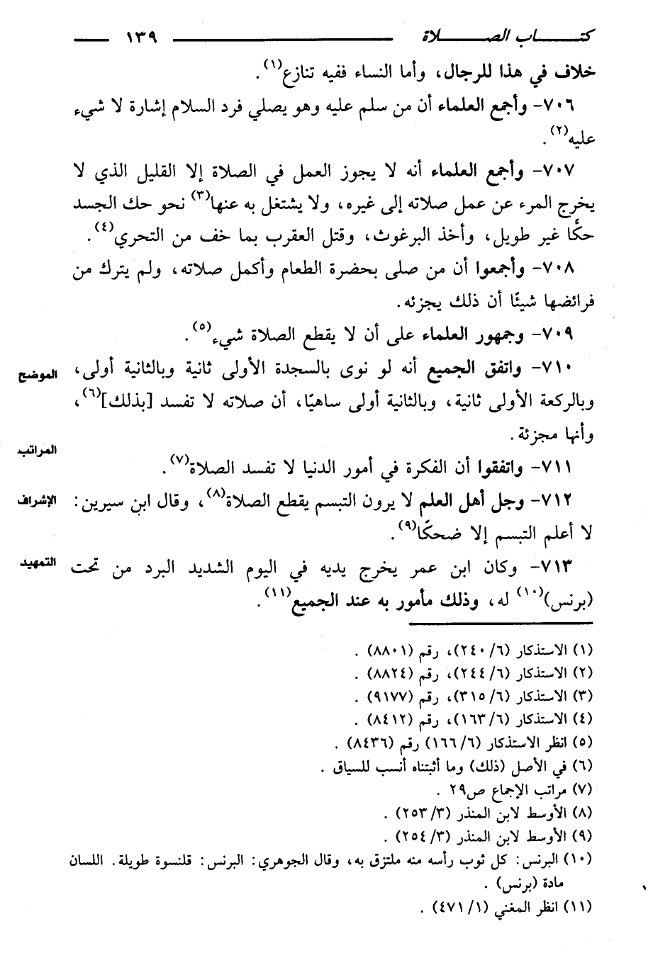 ٧٠٦ - وأجمع العلماء أن من سلم عليه وهو يصلي فرد السلام إشارة لا شيء عليه.
