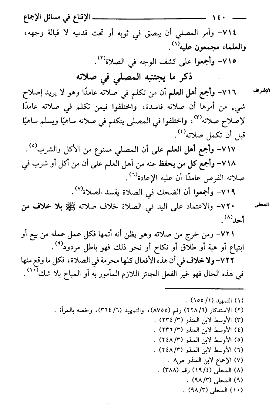 ٧١٦ - وأجمع أهل العلم أن من تكلم في صلاته عامدًا وهو لا يريد إصلاح شيء من أمرها أن صلاته فاسدة، واختلفوا فيمن تكلم في صلاته عامدًا لإصلاح صلاته، واختلفوا في المصلى يتكلم في صلاته ساهيًا ويسلم ساهيًا قبل أن تكمل صلاته.