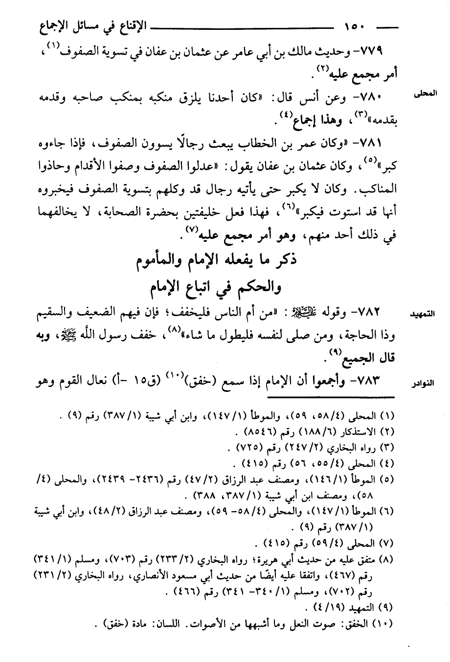٧٨١ - «وكان عمر بن الخطاب يبعث رجالاً يسوون الصفوف، فإذا جاءوه كبر»، وكان عثمان بن عفان يقول: «عدلوا الصفوف وصفوا الأقدام وحاذوا المناكب. وكان لا يكبر حتى يأتيه رجال قد وكلهم بتسوية الصفوف فيخبروه أنها قد استوت فيكبر»، فهذا فعل خليفتين بحضرة الصحابة، لا يخالفهما في ذلك أحد منهم، وهو أمر مجمع عليه.
