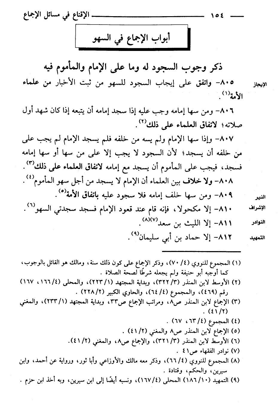 ٨٠٥ - واتفق على إيجاب السجود للسهو من ثبت الأخبار من علماء الأمة.