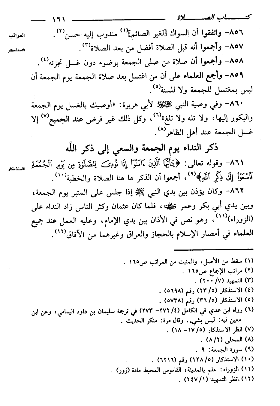 ٨٦٠ - وفي وصية النبي عليه السلام لأبي هريرة: «أوصيك بالغسل يوم الجمعة والبكور إليها، ولا تله ولا تلغ»، وكل ذلك غير فرض عند الجميع إلا غسل الجمعة عند أهل الظاهر.