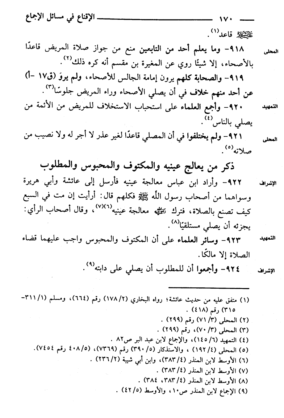 ٩١٩ - والصحابة كلهم يرون إمامة الجالس للأصحاء، ولم يرو عن أحد منهم خلاف في أن يصلي الأصحاء وراء المريض جلوسًا.