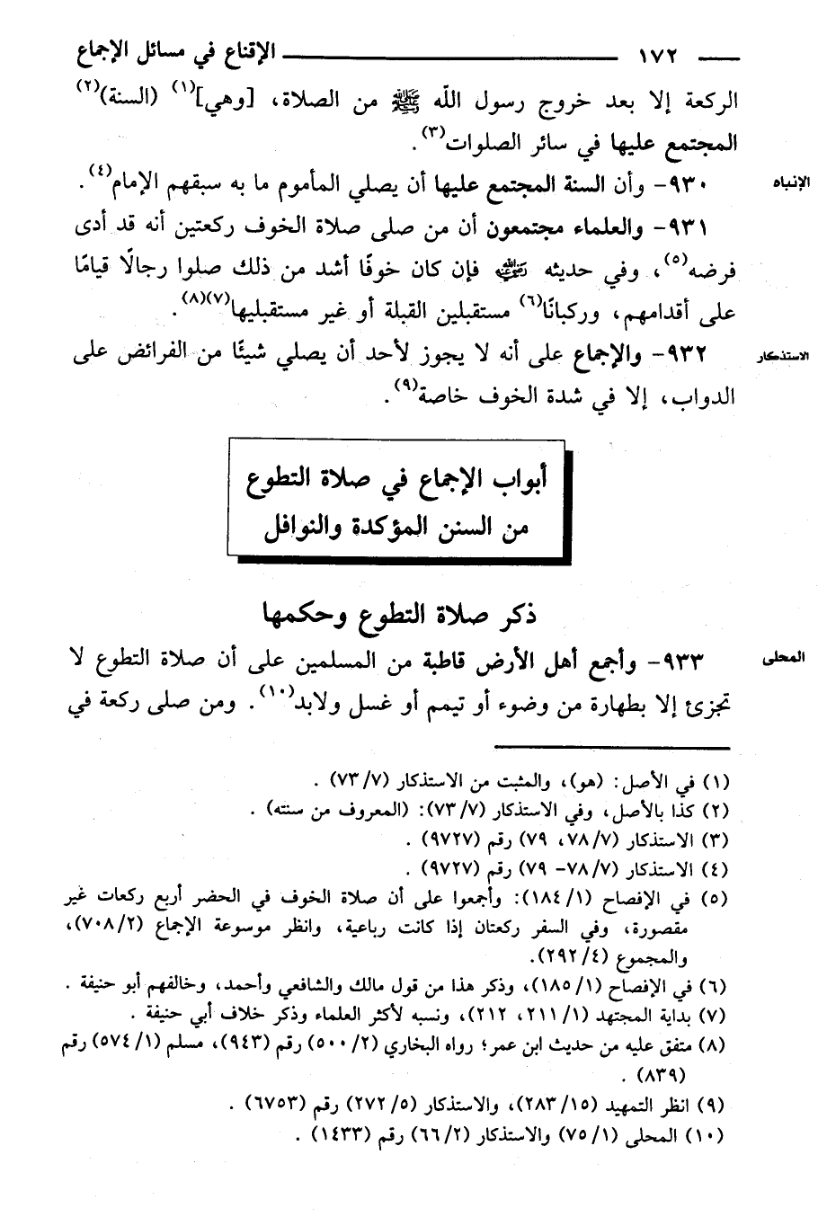 ٩٣٣ - وأجمع أهل الأرض قاطبة من المسلمين على أن صلاة التطوع لا تجزئ إلا بطهارة من وضوء أو تيمم أو غسل ولا بد. ومن صلى ركعة في