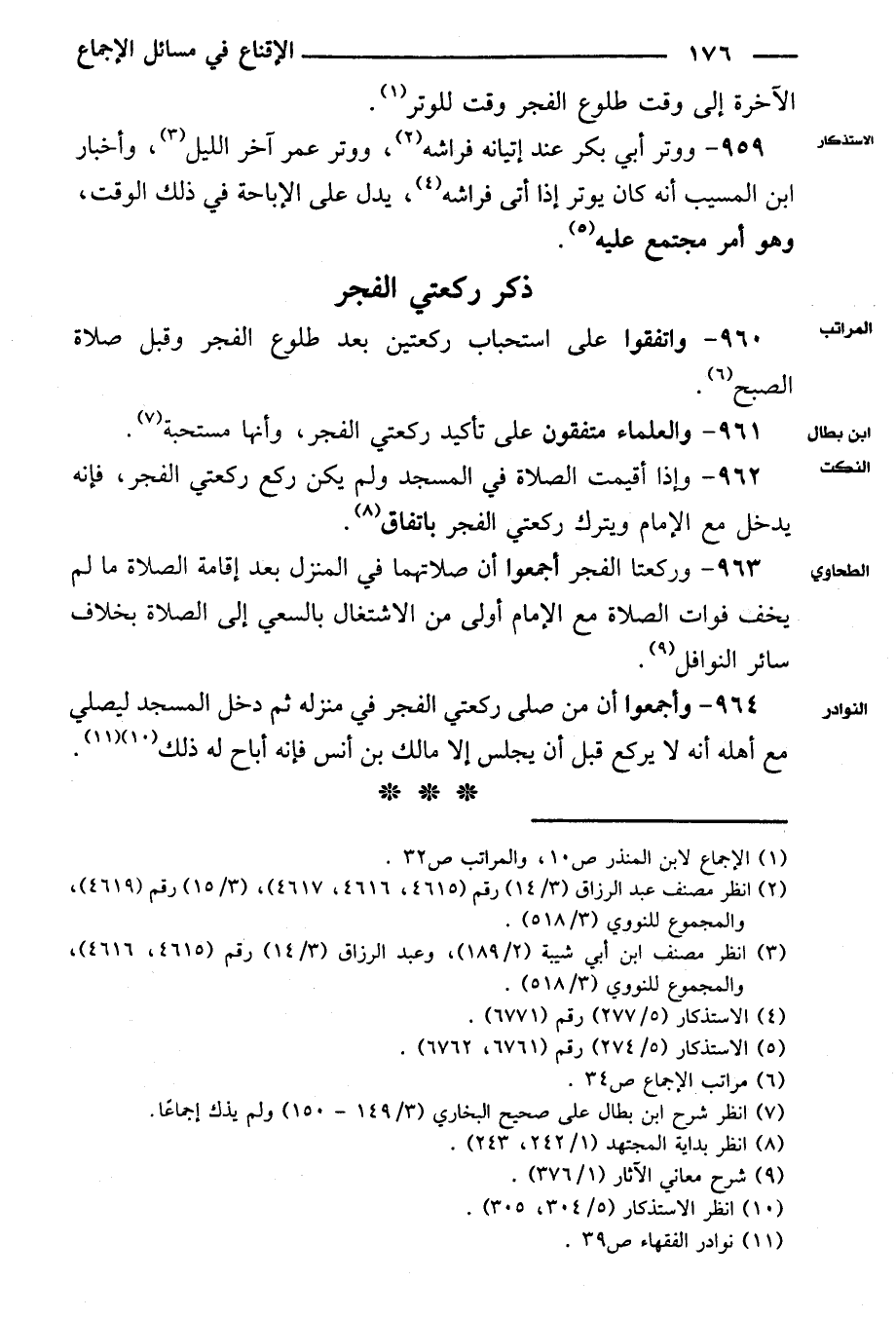 ٩٦٠ - واتفقوا على استحباب ركعتين بعد طلوع الفجر وقبل صلاة الصبح.
