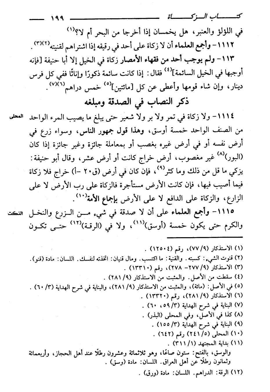 ١١١٥ - وأجمع العلماء على أن لا صدقة في شيء من الزرع والنخل والكرم حتى يكون خمسة (أوسق)، ولا في (الرقة) حتى تكون