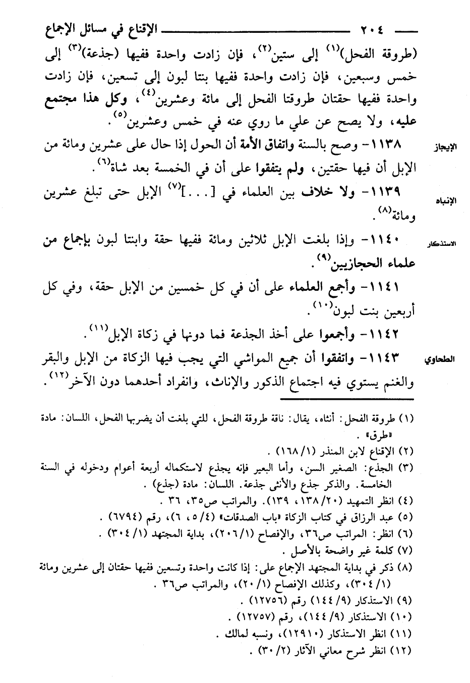 ١١٣٨ - وصح بالسنة واتفاق الأمة أن الحول إذا حال على عشرين ومائة من الإبل أن فيها حقتين، ولم يتفقوا على أن في الخمسة بعد شاة.